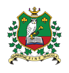 The main part of the design features the white owl, emblem of wisdom, perched on the book of education and tightly clutching the Lily of Purity. The "shamrock" is emblematic of the land of our ancestors. The whole design is ensconced on a shield surrounded by a garland of maple leaves professing our loyalty to Canada.