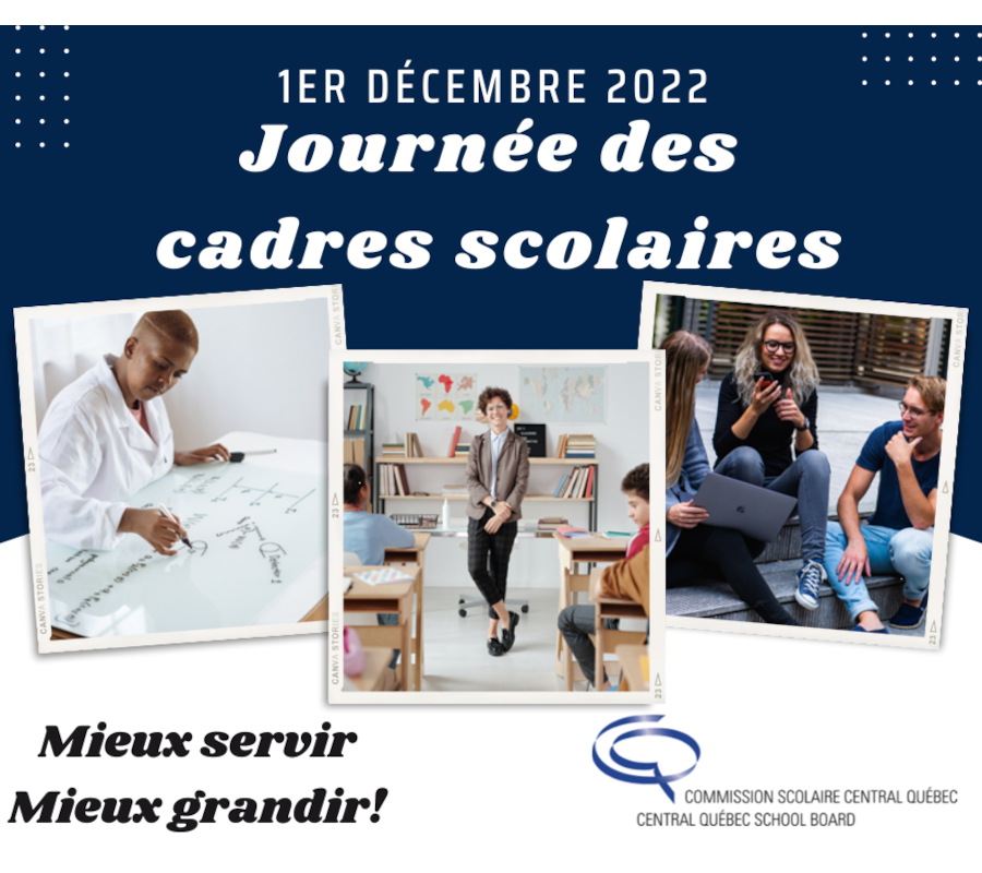 La Commission scolaire Central Québec (CSCQ) est heureuse de mettre en évidence, en cette journée des cadres scolaires, l’implication remarquable de ses administrateurs. Nous remercions tous nos gestionnaires de notre centre administratif, notre centre d’éducation des adultes & de formation professionnelle et de nos écoles primaires et secondaires pour leur rôle essentiel dans la réussite de tous.