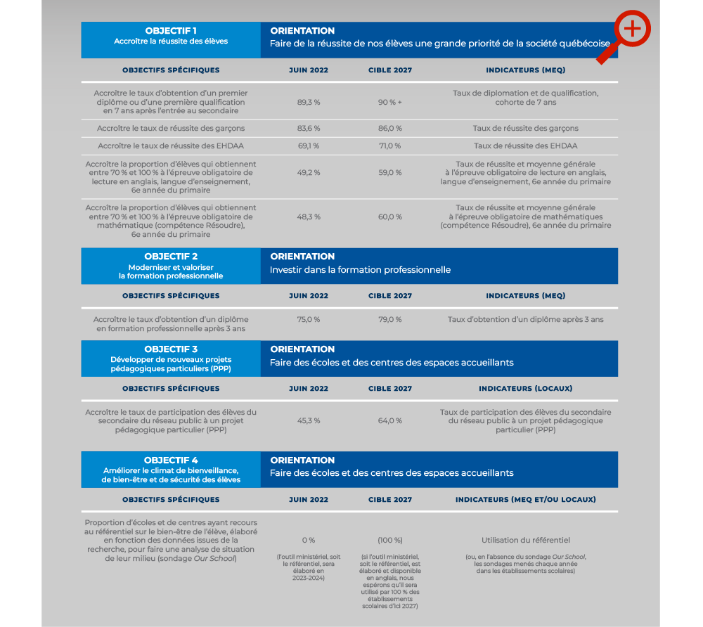 Cible des domaines d’amélioration de la réussite éducative propres à la CSCQ en conformité avec nos quatre priorités